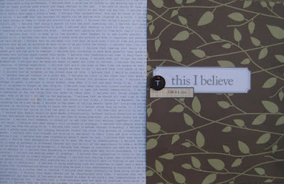 The first couple of pictures are for a pictureless LO called "This I believe." Basically, the task was to put together a list of things that you believe in... I was a bit worried in the beginning that I wouldn't have enough to fill a page, but suprisingly enough, once I got started, the words just started flowing.